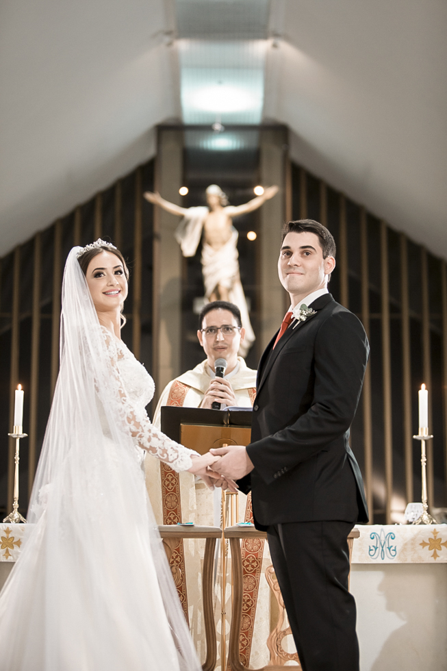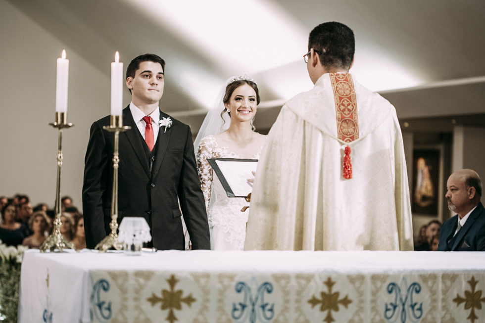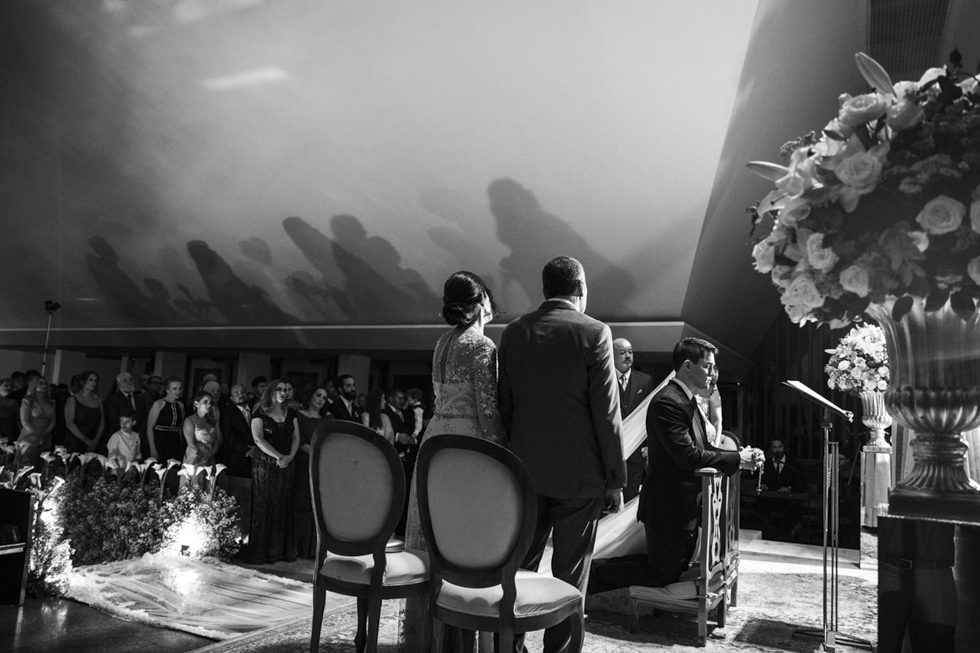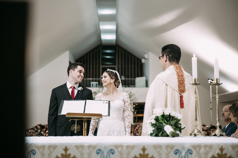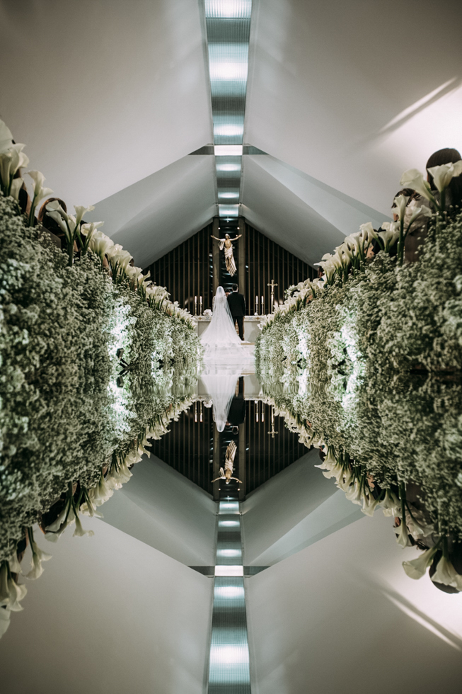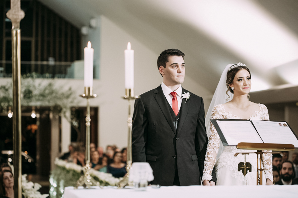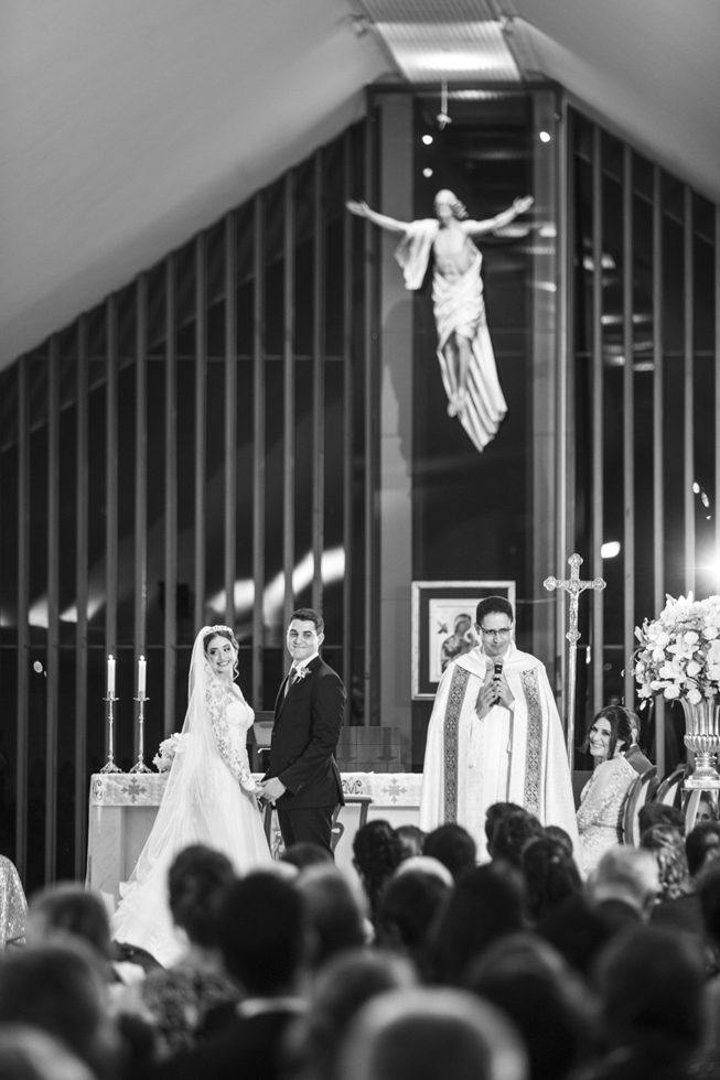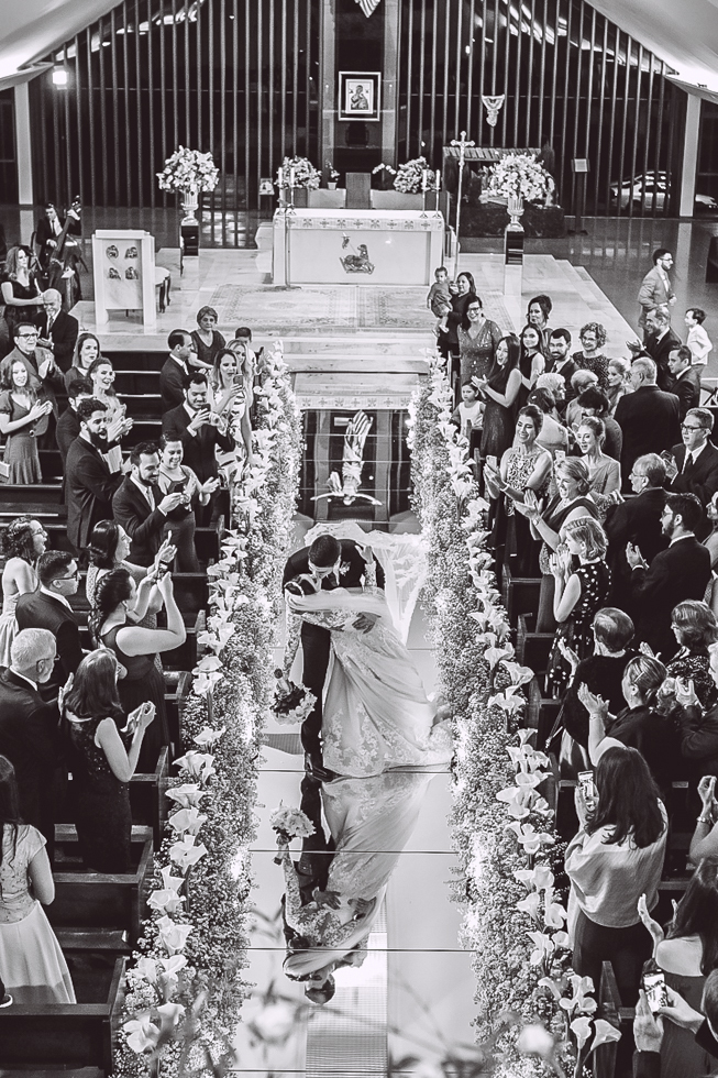 Para a cerimônia, o casal escolheu a igreja queridinha das noivas - a Nossa Senhora do Perpétuo Socorro - que estava lindamente decorada, com direito a tapete de espelhos e arranjos florais que harmonizavam muito bem com a peculiar nave.
